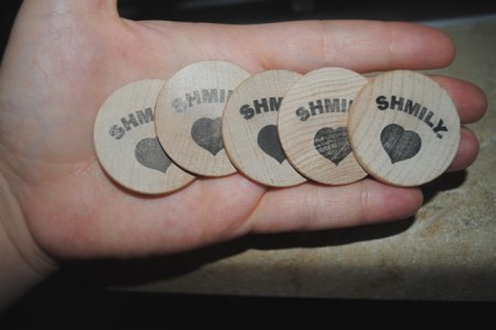 SHMILY coins are small (1½” round) wooden tokens that can be hidden in your loved one’s wallet, purse, lunch bag, pillow, suitcase, dashboard, under their windshield wiper, in a card, briefcase, or any other place where it is sure to be found with an appreciative smile. SHMILY coins renew the playful part of any loving relationship, whether it’s a spouse, sibling, child or friend. Everyone enjoys being reminded that they are loved–especially when the reminder comes at an unexpected time or place!