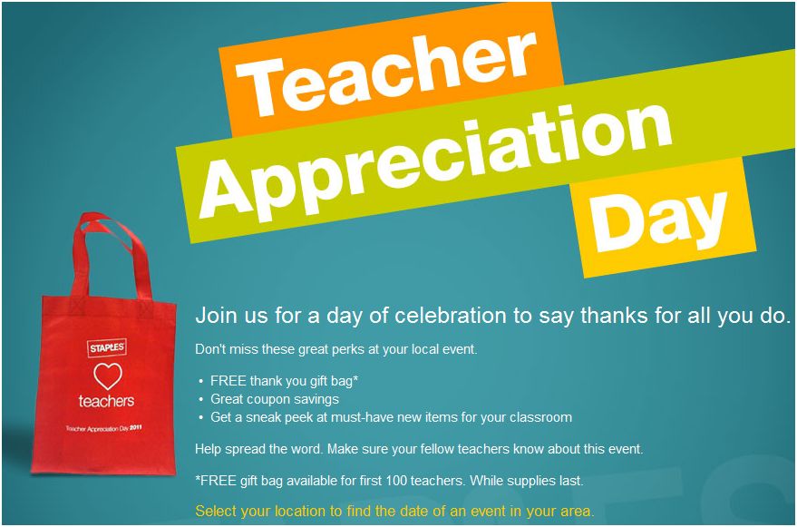 Staples hosts a Teacher Appreciation Day for teachers, where the first 100 teachers can get a FREE gift bag (shown in the pic above), coupons and sneak peeks at must-have new itmes.  The dates for these ”Appreciation” days vary depending on the location of your Staples.