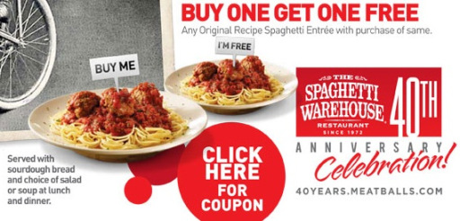 In celebration of National Spaghetti Day today, January 4th ( 1-4-2013 ), Spaghetti Warehouse has a BOGO FREE Deal on any Original Recipe Spaghetti Entree when you present the coupon found via Facebook! I wish we had one near us…I love Pasta!! Click here to find a location near you.