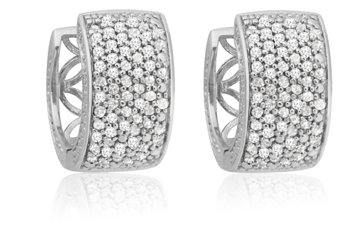 Huggie earrings boasting 1 carat worth of diamonds in a pave setting glitter with glamour. Made of sterling silver, the earrings sport a hinged back and click-shut closure. Floral patterns adorn the back and the earrings measure 19 millimeters in diameter. Elegantly classic, these diamond huggie earrings add a little spark to your day.