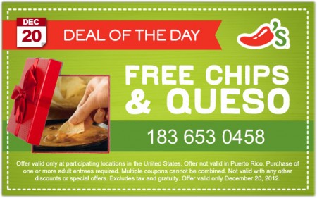 Today’s offer, December 20th ( 12-20-2012 ) is a FREE Chips and Queso at Chili’s!