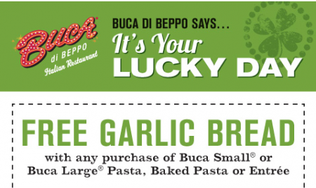 May the luck of the Irish be with you this week, as we get ready to celebrate the greenest holiday of the year…St. Patrick’s Day!! For those of you lucky enough to have a Buca di Beppo near you, stop by this Sunday, March 17th ( 3-17-2013 ) and get a FREE order of Garlic Bread with any purchase of Buca Small or Buca Large Pasta, Baked Pasta, or Entree.