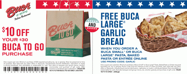 Happy 10-11-2012 Day!! To make this day even more fun, you should treat your family to FREE Garlic Bread from Buca Di Beppo! TODAY ONLY, when you order a Buca Small or Buca Large Pasta, Baked Pasta or Entree ONLINE, you can get a FREE Large Order of Garlic Bread!