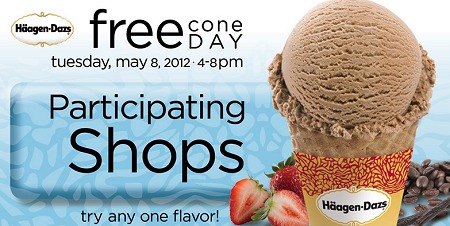 Yeppers, FREE CONE Day at Haagen Dazs is TODAY ONLY, 5-8-2012, from 4-8pm at participating locations listed here.