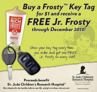 WOW!!! For those of you that have a Wendy’s near you, here is an amazing promotion going on at select locations. Several are picking a charity of their choice, and encouraging their customers to donate $1. In exchange for your generosity, you will get a Frosty Key Tag (as shown above) which will entitle you to a FREE Jr. Frosty with ANY purchase every single time you go to Wendy’s, through December 2013!!
