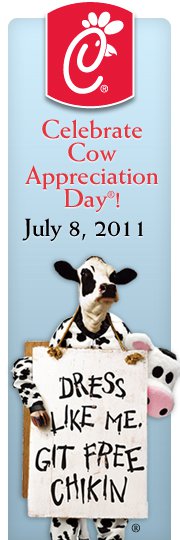 Celebrate Cow Appreciation Day with Chic-fil-A! Go to your local chic-fil-a restaurant(click here to find one near you), dressed as a cow and receive a free meal on Friday, July 8th. Don’t have a costume? No problem. CLICK HERE and you can print out your very own cow costume kit.