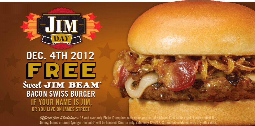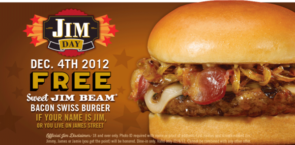 Jim Day is BACK! On December 4th, 2012 ( 12-4-2012 ), Red Robin is giving EVERY person with the first name of Jim a FREE Sweet Jim Beam® Bacon Swiss Burger just for being named Jim. This year, they’ll also share the burger love with those who live on James Street!