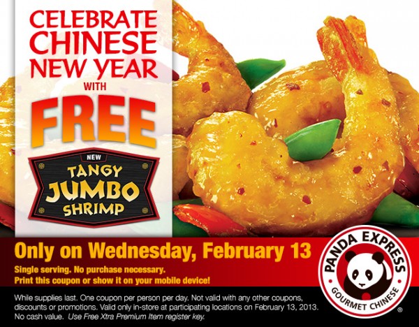 Next Wednesday, February 13th ( 2-13-2013 ), be sure to stop by Panda Express and get a FREE Tangy Jumbo Shrimp! Simply print off this coupon, or show it on your mobile device to get yours!