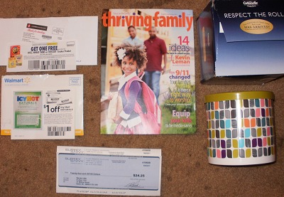 I got the FREE Cottonelle Roll Cover, Coupon for a FREE Box of Ritz, Wheat Thins or Triscuit Crackers from MyCokeRewards, Free Sample of Icy Hot Naturals and Coupon from Walmart and a FREE Issue of Focus On The Family’s Thriving Family Magazine.