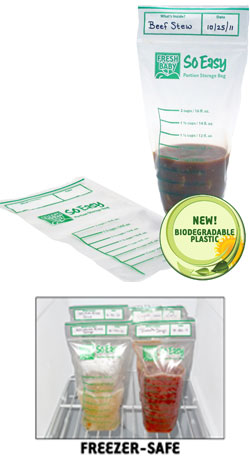 Fresh Baby’s So Easy Portion Storage Bags are a simple storage solution! The biodegradable, freezer-safe food storage bags (50 count) have clearly marked measurements in both ounces and cups to help parents understand and control portion sizing for the entire family. The bags stand upright, even while filling, and feature a zipper seal and write-on area for accurate identification and storage time.