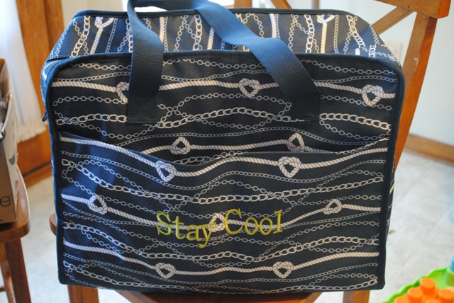 This tote is deep enough to carry a case of soda and wide enough to carry a casserole dish. And it has a pvc lined interior for easy cleaning. 🙂 I absolutely LOVE my Chains Ahoy Market Thermal Tote, with the personalization “Stay Cool” on the front. The tote itself is very stylish and perfect for a trip to the park, and a cross country summer vacation – both of which we used in the past month. Our family was able to store snacks, water, juice, milk and more – and it stayed cold for as least the 8 hours stored inside.