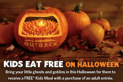 Treat yourself and the kids this year on Halloween ( 10-31-2012 ) with dinner at Outback Steakhouse. For every paid adult entree, you can get 1 FREE Kids Meal. There is no coupon required. Please note: This offer is for children ages 10 and under.