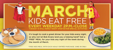 Take a break one day this week (or 1 night during a weekday) and treat the kids to a FREE Kids Meal at Bob Evans! For the entire month of March, Kids Eat FREE every weekday from 2 p.m. to Close, with each Adult Entree purchased!