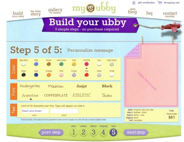 In just 5 easy steps, you can choose fabric for the front and the back, the edging (ribbon) that goes along the outside, and you can even get it customized with a name or initials.