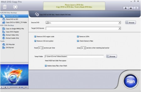 Constantly Support Latest DVD ProtectionsOne tool makes all known DVD protections accessible and set free CSS, Region Code, RCE, UOPs (FBI warnings), Sony ARccOS, APS as well as Disney X-project DRM tricks. Disney Fake checking feature entitles WinX DVD Copy Pro one of the best three DVD cloning software capable of successfully copying the latest DVD with 99 titles.
