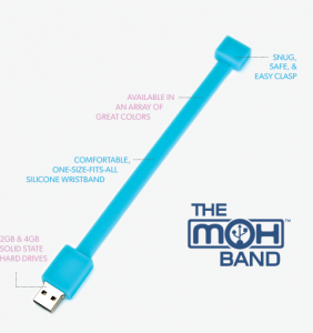 The MoH Band (Memory on Hand Band) is a USB flash drive wristband, designed to comfortably fit your wrist (just like a bracelet). It allows users to carry all their digital files wherever they go. The MoH Band allows you to travel everywhere with your digital files right on hand. MoH Bands are compatible with USB equipped devices such as TVs, printers, speakers, gaming consoles, and electronic photo frames, allowing you to view, transfer, and share your latest files, photos, videos and music recordings.