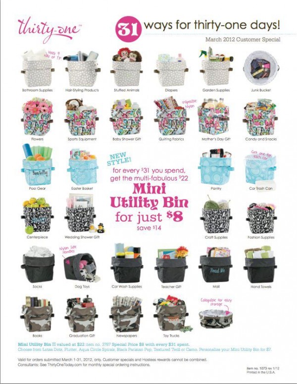 Spring has sprung early with Thirty-One’s new Spring Catalog and the March 2012 Customer Special on the multi-fabulous Mini Utility Bin. Our consultant and friend, Daphne Boyd is so excited about this month’s offer, that she would like to give one away to a very lucky Frugal Fabulous Finds fan!
