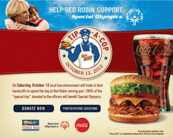 You are here: Home / Restaurant Savings / SPECIAL OLYMPICS TIP-A-COP AT RED ROBIN 10-13-2012
