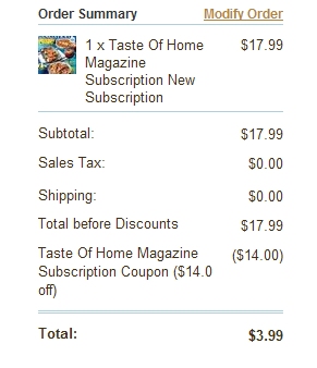 The $17.99 sale price will be reduced to just $3.99! This is a very Frugal Fabulous price for a Taste of Home Magazine subscription!